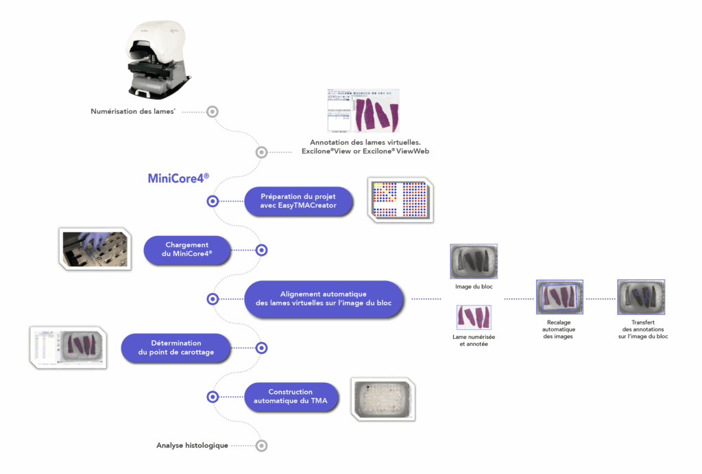 MiniCore®4 simplifie fortement les opérations en automatisant la construction des Tissue Micro-Arrays. Le logiciel MiniCore®4 affiche toutes les informations en temps réel. Il réalise la superposition et le recalage automatique de lames virtuelles annotées sur l’image des blocs donneurs grâce à l’intelligence artificielle, ce qui permet une sélection des zones de carottage très précise.